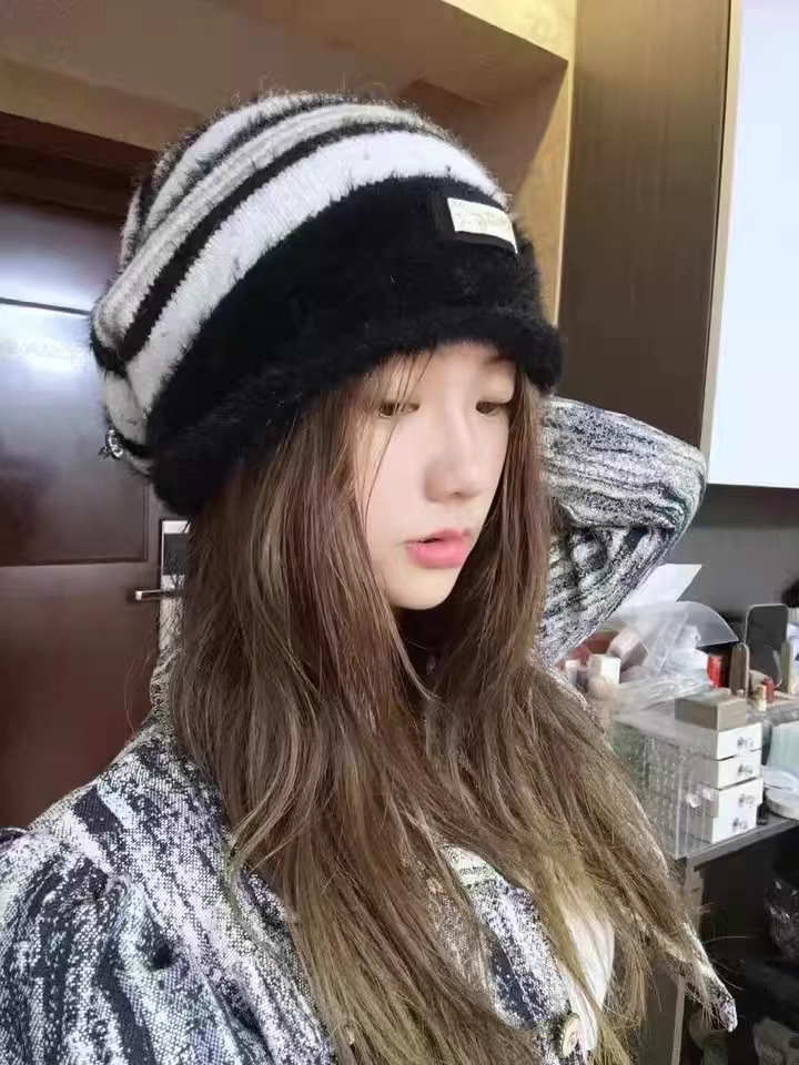 ニット帽|ストライプ柄・防寒・耳当て付き・小顔効果・ボリューム感・おしゃれ
